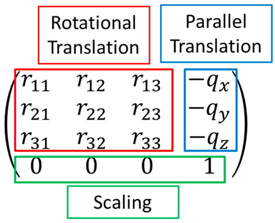In Figure 6, the components from r11 to r33 represent the rotational movement of the coordinate system, and they are expressed by the multiplication of the equation of the rotational movement around each axis.