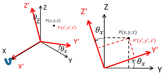 We describe the rotational movement Rx in the coordinate system around the X axis as an example of the rotational movement around the axis. As shown in Figure 7, when the coordinate system is rotated by θx about the X axis, the coordinates P′(x′, y′, z′) of the point in the coordinate system after movement are given by Equation (4). Equation (4) is expressed using coordinates P(x, y, z) and θx.