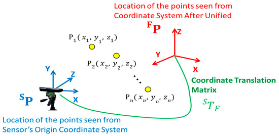When there are n points in space, as shown in Figure 8, the coordinates in the Kinect coordinate system of the nth point are defined as and those in the unified coordinate system as . When the coordinates in the homogeneous coordinate system are represented by a matrix, the coordinates of the 1st to nth points as viewed from each coordinate system are expressed by