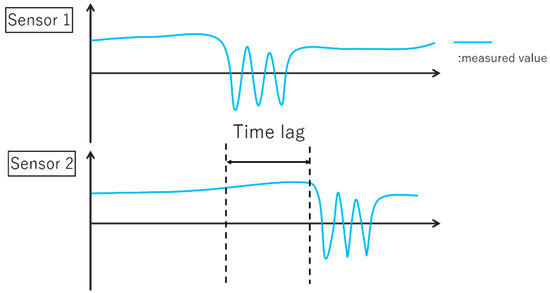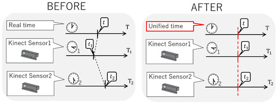 In the measurement by multiple sensors, the measurement start timing and the end timing are different because the time of each sensor is different. As shown in Figure 9, even if the same operation is recognized, a time lag occurs, and an accurate analysis cannot be performed; therefore, time synchronization of multiple sensors is indispensable. By performing time synchronization as shown in Figure 10, it is possible to perform an accurate analysis using multiple sensors. Nevertheless, with the conventional synchronization of multiple Kinect sensors, time synchronization has not been successful [29,30]. Conventional time-synchronization research is based on the establishment of a unified time and server. Previous studies that used a unified time did not state about the accuracy of time synchronization, assuming that the cycle of unified time does not fluctuate. However, there is a possibility that the unified time deviates. In addition, any research that establishes a server and synchronizes time is accurate. However, to process and synchronize information with high capacity and geometric qualities like the Kinect V2 sensor with color images and depth information, it is necessary to establish an expensive server with a fast processing time. The establishment of an expensive server has no versatility if we consider the realization at our museum; this is the original purpose of our study. Therefore, we did not set up a server, and referenced the existing server, conducted time synchronization by considering the processing time of each personal computer, and evaluated the accuracy.