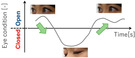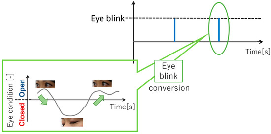 Eye-blink detection follows the flow of human detection, skeleton information detection, face recognition, and finally pupil detection, as detailed in the following text. First, the Kinect sensor performs human detection by using a database based on the learning data of skeletal information of a large number of people. Next, the sensor identifies a person based on the person’s coordinate information. Accordingly, the same person was tracked in a multipeople environment. Then, the sensor recognizes a human face and extracts the 3D coordinates of 1347 points on the face as feature points [31]. Based on these information, the eye position, and then the eye blinking were determined. The two states of the pupil (open/closed eyes) were determined based on the ratio of the iris width to the maximum iris width obtained by counting the number of black pixels. The state was recognized as “OPEN” when opening eyes and “CLOSE” when closing eyes based on the set threshold value. It is said that people’s interest can be gauged using their eye blink. Figure 12 shows the appearance of OPEN and CLOSE eyes. As shown in Figure 12, when the state changes from OPEN to CLOSE, and to OPEN again, we count it as one eye blink; the measurement cycle was 30 Hz.