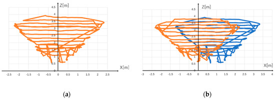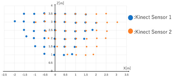 Figure 16 shows the coordinates of each measurement point after coordinate transformation; this is the measurement result of Kinect Sensor 1 and the measurement result of Kinect Sensor 2 that unified the coordinate system using coordinate transformation. In Figure 15, points that could not be measured outside the recognition range of the Kinect sensor are not plotted. From this result, it can be seen that the coordinate transformation is performed by the simultaneous transformation matrix. Next, we evaluate the error of coordinate transformation. The error is the difference in distance between the known coordinates and the distance difference between the known coordinates and the coordinates of person coordinates measured by Kinect Sensor 2; this is the distance between the known coordinates of the X-Z plane and the coordinates after coordinate system unification.