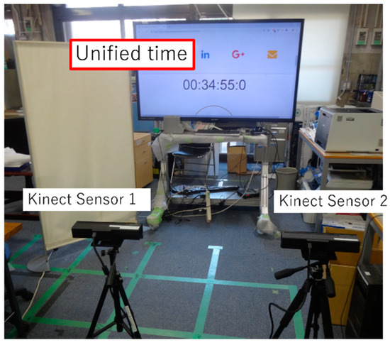 In this experiment, we used a clock to unify time using two Kinect sensors. Figure 17 shows the experiment environment. We performed time synchronization between Kinect sensors 1 and 2, which are shown in Figure 17. We explain the experimental procedure below. First, we start measuring using Kinect sensor 1. Second, we start measuring Kinect sensor 2. Therefore, both Kinect sensors measure at and record for different arbitrary times. The measuring time is 53 s for each Kinect. After the end of the measurement, we standardized the Kinect sensors 1 and 2 with a clock for unified time. Through these experiments, we evaluate whether it is possible to synchronize time between Kinect sensors 1 and 2.