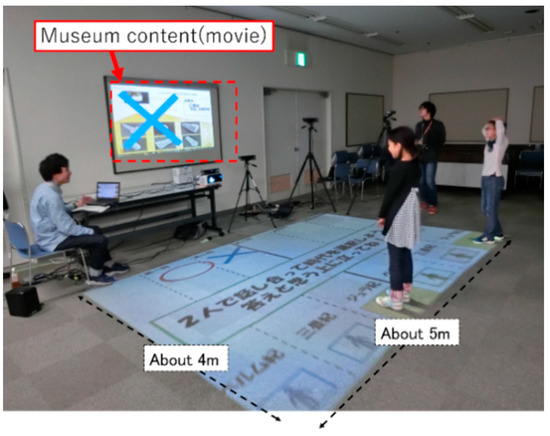 Figure 20 shows the experimental environment. By cooperating with two Kinect sensors that became clear in our experiment, it is possible for a person to track a range of 5 m × 4 m. Therefore, the museum contents to be evaluated in this experiment is done within 5 m × 4 m. We sense the interests of the four people who experience the content within this range.
