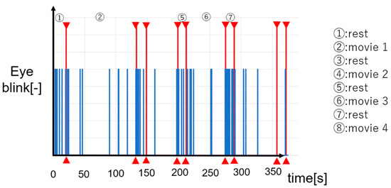 We describe the experimental results of one subject as an example. One eye blink is converted on the graph as shown in Figure 21. Conversion result are shown in Figure 21. In sections 1, 3, 5, and 7, subjects are taking a break. In sections 2, 4, 6, and 8, subjects are viewing content videos of museums. First, during the experiment, it is understood that the data is always acquired without data loss. As shown in Figure 22, there are many eye blinks during a break. We evaluate based on this result. First, the eye blink rate is calculated as