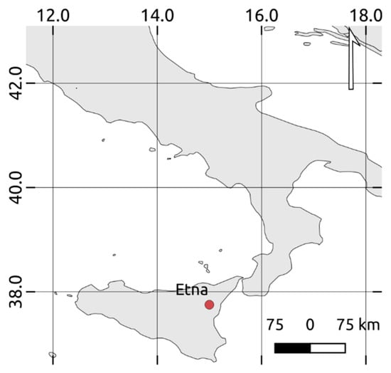 Mt. Etna (Sicily-Southern Italy; see Figure 1) is the most active volcano in Europe. Frequent eruptions (e.g., gas/ash emissions, Strombolian activities, lava fountains, lava flows) characterize this stratovolcano (e.g., []). Eruptions may occur both at summit craters, namely Voragine (VOR), Bocca Nuova (BN), North East Crater (NEC) and New Southeast Crater (NSEC), and on its flanks where lava effusions pose the major risk for surrounding populated areas (e.g., []).