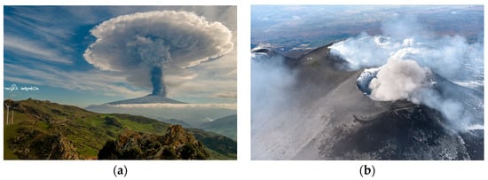 (a) Mt. Etna eruptive column of 4 December 2015, photograph courtesy of Veronica Testa; (b) Explosion from North East Crater (NEC) of 14 December 2015, photograph courtesy of Marco Neri.