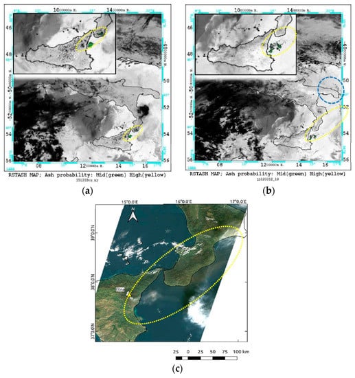 In more detail, Figure 3a shows the RSTASH product of 08:40 UTC revealing the presence of an ash plume dispersing from the Mt. Etna crater area towards the Ionian Sea (in the E-NE direction), covering Sicily and part of Calabria region (Southern Italy) (see green pixels within the dotted yellow ellipse). The RSTASH map of Figure 3b, referring to data of 12:44 UTC, showed that the ash plume probably extended up to the coasts of Puglia region (Southern Italy), as indicated by ash pixels flagged within the dotted blue circle. Those maps provided information about the monitored ash phenomenon in good agreement with some independent satellite observations. An example is shown in Figure 3c, displaying the Landsat-8/OLI (Operational Land Imager) true color imagery, at 30 m spatial resolution acquired on 3 December at 09:35 UTC. The figure confirmed that the presence of a thin ash plume (in brown within the area marked by the yellow dotted ellipse) dispersing from the Mt. Etna crater area (see yellow triangle) in the E-NE direction, affecting the coasts of the Calabria region where it appeared slightly more extended than that indicated by RSTASH. The latter generated a few artefacts mainly close to the area marked by the yellow ellipse, where the RGB (Red, Green, Blue) product of Figure 3c did not provide any evidence of ash.