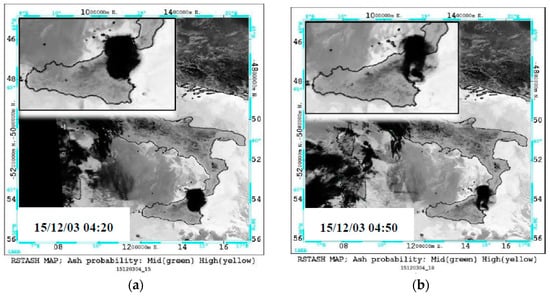 In this section, we show results of ash detection performed by RSTASH in early December 2015. Figure 3 displays the RSTASH maps (the background shows the brightness temperatures measured in the 11 µm channel), which were automatically generated at IMAA a few minutes after the sensing time, from two consecutive AVHRR overpasses of 3 December. Ash pixels were depicted in two different colors based on confidence levels of detection (i.e., green: low-medium confidence level; yellow: high confidence level).