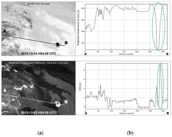 Spinning Enhanced Visible and Infrared Imager (SEVIRI) data of 3 December 2015 at 04:00 UTC: (a) Top: Brightness Temperature Difference (BTD) image; Bottom: brightness temperature in the channel 7 (at 8.7 µm); (b) signal changes recorded along the A-B transect region. Green ellipse indicate the region affected by the eruption column.