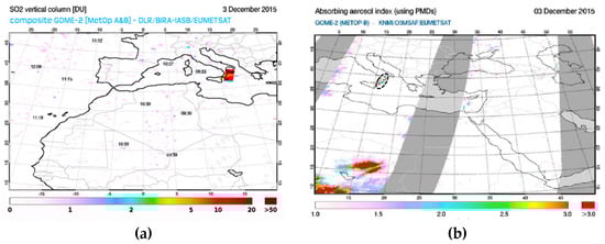Global Ozone Monitoring Experiment-2 (GOME-2) products of 3 December 2015 made available by Support to Aviation Control Service (SACS) (http://sacs.aeronomie.be/). (a) SO2 vertical column; (b) absorbing aerosol index map.