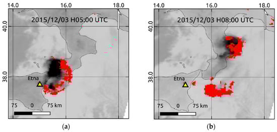 In recent years, a long series of powerful paroxysmal events took place at the crater area, revealing a general increment in the explosive activity []. Among those eruptions, the four paroxysms from VOR of 3–5 December 2015 were particularly intense (e.g., [,,]). The first one started on 3 December at around 02:30 UTC, generating an eruptive column extending up to 15 km above sea level (a.s.l.). This eruptive event ended at 03:30 UTC, causing the ashfall also in Reggio Calabria (Southern Italy), which is located about 70 km from the volcanic area [,,]. In the following hours, sporadic ash emissions took place at the BN and NSEC []. The day after (see Figure 2a), the second and third paroxysmal events occurred (during 9:10–10:10 UTC and 20:30–21:10 UTC, respectively), generating an eruptive column reaching about 13.4 km a.s.l. []. In addition, a new pit crater opening up on the East flank of the NSEC also emitted ash [,]. On 5 December, the volcano entered into the fourth paroxysmal phase, which lasted about one hour (i.e., from 14:50 UTC to 15:40 UTC). After those major eruptive events, NSEC activated emitting, during 6–8 December, a plume of fine ash (Strombolian explosions and a lava effusion also occurred from this crater). Almost concurrently, weak to moderate ash emissions took place at the NEC, first gradually increasing (i.e., after the end of the NSEC eruption) and then continuing at a decreased rate until 11 December []. In the late afternoon of 13 December, NSEC emitted once again ash. In the following two days, intermittent ash emissions took place at the NEC (e.g., see Figure 2b). Finally, after two-short lived events recorded at the VOR, minor ash emissions from NSEC occurred on 28 December [].