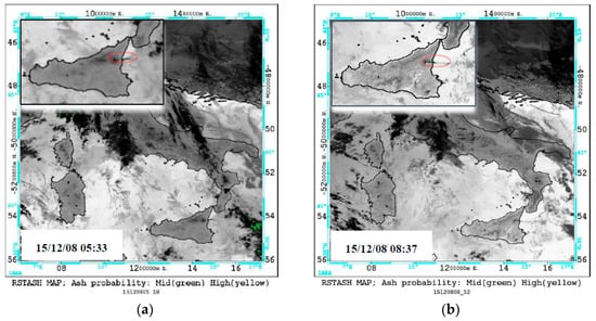 Table 1 reports values of ash coverage and plume height retrieved during 8–10 December, analyzing the same dataset of Figure 8. We estimated the plume height by comparing the minimum brightness temperature of ash pixels, measured in the 11 µm AVHRR channel, with the atmospheric temperature profiles from the NCEP (National Centers for Environmental Prediction) Reanalysis dataset. The latter provides information four times per day (i.e., at 00:00 UTC; 06:00 UTC; 12:00 UTC; 18:00 UTC) about a number of variables (e.g., air temperature, geopotential height, relative humidity) at 17 different pressures levels, with a spatial sampling of 2.5 × 2.5 degrees []. In more detail, we retrieved a range of ash plume top heights for each analyzed satellite scene by elevations with air temperatures closest (i.e., immediately above and below) to the minimum plume temperature measured by satellite (e.g., []). Table 1 shows that in the early morning of 8 December, when volcanic ash affected a very small area, the plume was at an altitude of about 3.2–4.4 km a.s.l., extending up to about 4.4–5.8 km a.s.l. during the night of the same day. Some hours later, although airborne ash affected a larger portion of the ROI, covering an area of about 1450 km2, plume height decreased ranging between 1.6 and 3.2 km a.s.l. This reduction in the plume altitude was possibly determined by a less efficient identification of ash pixels close to the eruptive center. Indeed, when RSTASH performed better in detecting the proximal plume region we retrieved a higher value of analyzed parameter; as for data acquired since 9 December at 08:16 UTC, when plume height was in the range of 3.2–4.4 km a.s.l.