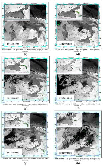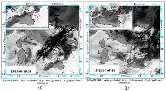 Figure 8 shows that the Mt. Etna plume was initially very small (e.g., see the few ash pixels flagged within the red ellipse; the other ones represented artefacts generated in correspondence of some cloudy areas), moving from Mt. Etna towards Ionian Sea, in the East direction. Starting from the evening of 8 December, plume direction changed from E to SE; see panels (a) and (b). A few hours later, the ash plume became more evident (e.g., see panel (c)). Besides, its features probably changed in terms of ash content and/or particle size, as indicated by the increase of ash pixels associated to a high confidence level of detection (i.e., those depicted in yellow). Since the early morning of 9 December, the plume dispersed over a larger sea area (see pixels flagged at around 36° N 17° E). Afterwards, the ash BTD signal weakened (see map in panel (f) generated under high values of satellite zenith angle), and a smaller portion of the plume was identified by satellite (see panels (g) and (h) for comparison). In the early morning of 10 December, a thin and less extended ash plume affected the region of interest (ROI) (see panel (j)). In the following hours, RSTASH did not provide any evidence of ash also because of limited AVHRR temporal coverage (currently 10 passages per day over Italy are available combining observations from NOAA and MetOp platforms), which did not enable the identification of intermittent/weak ash emissions that were in progress at the monitored volcano (see Section 1).