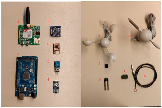 The external components are listed in Table 1. They are the sensors used to measure the air temperature, air pressure, air humidity, soil humidity and precipitation, as well as the wind speed and direction.