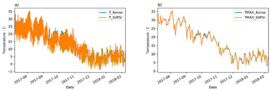 Although the 4onse-mod station has an anemometer, an anemoscope and a soil humidity sensor, it was not possible to evaluate the quality of these data since Trevano does not have equivalent sensors. In both stations the air temperature sensor is placed in a solar radiation shield, respectively located at 1.8 (4onse-mod) and 2.2 (Trevano) meters above the ground. In agreement with the World Meteorological Organization (WMO) requirements [], the air pressure and air humidity sensors are also mounted within the same shield.