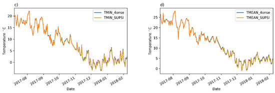 Temperature time series comparison: (a) 10 min aggregated values; (b) daily maximum values; (c) daily minimum values; (d) daily mean values.