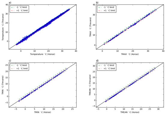 Trevano versus 4onse weather station temperature data: (a) 10 min aggregated values; (b) daily maximum values; (c) daily minimum values; (d) daily mean values.