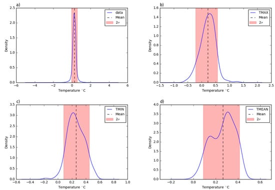 In Figure 7, the density probability plots offer an overview on the deviations distribution. 90% of the residuals fall inside a range between −0.047 and 0.57 °C for the 10 min aggregated values; 0.08 and 0.45 °C for the daily minimum temperature values; −0.22 and 0.56 °C for the daily maximum temperature values; and 0.09 and 0.41 °C for the mean daily temperature values. The mean error values fit the mode of the curve in all the considered plots, except for the daily mean temperature density plot where two peaks can be identified: one with a lower probability than the mean value and the other, which corresponds to the most frequent error, with a higher probability than the mean value.