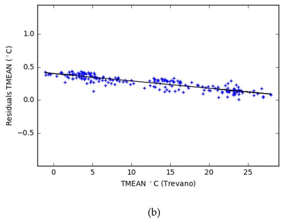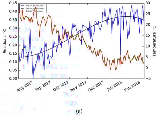 Finally, in the graphs in Figure 8, the trend of the residuals was analyzed using the daily mean temperature time series of the two stations. This analysis identified how, at lower temperatures (winter), the residuals increase and a lower accuracy is therefore expected. The residuals are near zero when high temperature values are recorded. Nevertheless, the observed residuals are always below 0.5 °C of variation and below 0.1 °C when temperatures are in close to 30 °C.