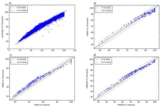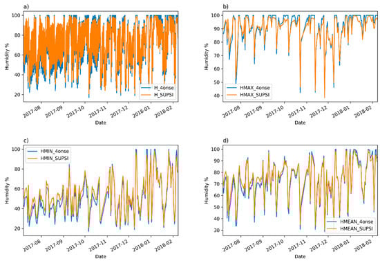 The Trevano versus 4onse weather station humidity data: (a) 10 min aggregated values; (b) daily maximum values; (c) daily minimum values; (d) daily mean values.