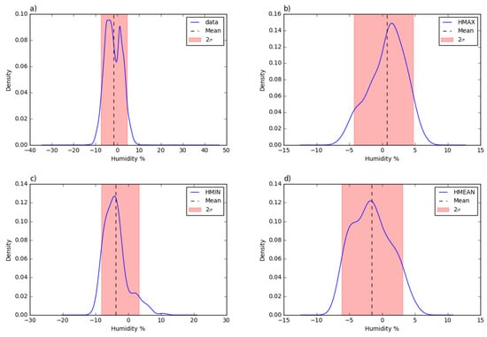 Compared to the temperature probability density functions, the relative humidity time series curves (Figure 11) have a greater value dispersion since the probability peaks are not as high as the temperature analysis showed. In addition, the tails of the curves span over bigger intervals. Even if the results are good enough and acceptable, the measures of the relative humidity are not as accurate as for the previous parameter.
