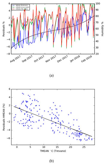 (a) The daily mean humidity of the Trevano and 4onse-mod stations plus the residuals time; and (b) the residuals of the daily mean humidity vs. daily mean temperature.