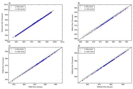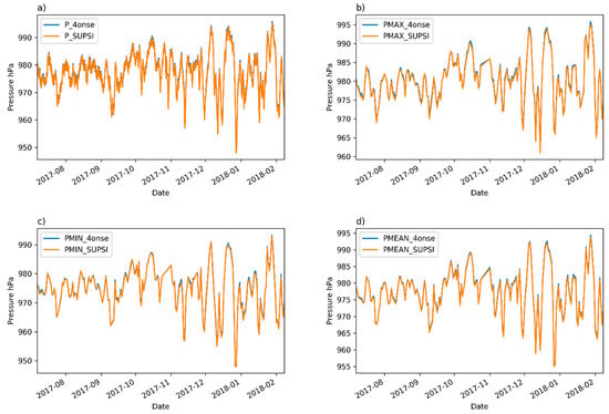 The Trevano versus 4onse weather station pressure data: (a) 10 min aggregated values; (b) daily maximum values; (c) daily minimum values; (d) daily minimum values.