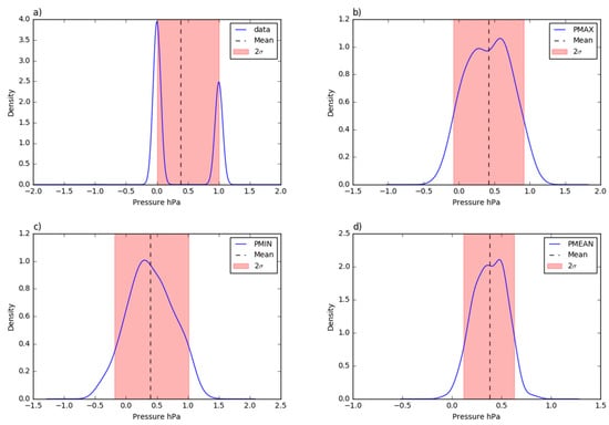 The probability density function of the residual deviations from the Trevano pressure time series: (a) 10 min aggregated values; (b) daily maximum values; (c) daily minimum values; (d) daily mean values.