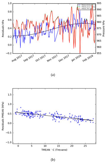 (a) The daily mean pressure of the Trevano and 4onse-mod stations plus the residuals time series; and (b) the residuals vs. the daily mean temperature.