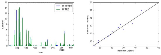 Rainfall time series graph (left) and scatter plot (4onse vs Trevano) (right).