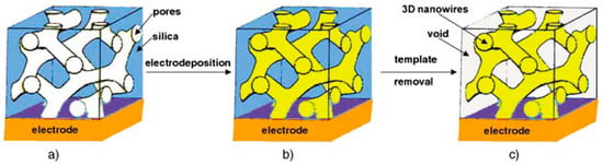 Electrochemical deposition is an efficient procedure to prepare metal nanoparticles but it is usually less utilized than wet-chemical methods. This approach can sometimes display some limitations as to the nanomaterial dimensions and the allowed morphologies, but it shows a lot of advantages, particularly related to the rapid synthesis time, the absence of chemical reductants or oxidants, and of undesired by-products [4]. Furthermore, when the modifier film is directly deposited on the electrode it permits a better adhesion to be obtained [5]. Electrodeposition is widely applied using different electrochemical techniques, such as cyclic voltammetry, potential step and double-pulse deposition [6]. The possibility of a precise particle size control is achieved by adjusting current density or applied potential and electrolysis time [7]. Furthermore, combined with a template, electrochemical synthesis gives the opportunity to produce a variety of 3D networks, e.g., through mesoporous silica films (this is the case of noble metal nanowires, see Figure 1) [8].