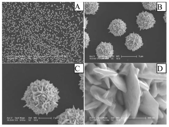 Typical FE-SEM images of the hierarchical flowerlike Au microstructures deposited on ITO substrate at different magnifications; The scale bars for (A–D) are 100, 5, 2 μm and 500 nm, respectively. Images reproduced from [16] by permission of The Royal Society of Chemistry.