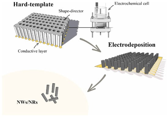 Schematic representation of NRs/NWs electrosynthesis using the hard-template approach. First, the hard template in which the nanochannels (shape director) are observed, equipped with a conductive layer in one of the two sides, is used as a working electrode in the electrodeposition process in a three-electrode cell. After electrodeposition the hard-template and/or conductive layer can be removed to obtain free-standing NRs/NWs. Image reproduced from [24] with permission.