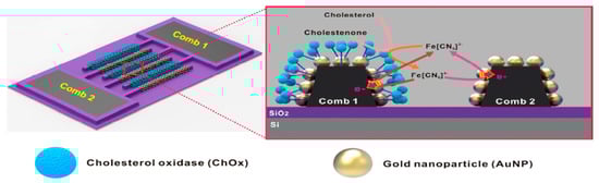 Schematic diagram of the sensing principle based on the redox cycling of [Fe(CN)6]3−/[Fe(CN)6]4− between enzyme and electrode surfaces at nano-sized gold nanoparticle (Au-NPs)/carbon interdigitated electrodes (IDEs), selectively functionalized with cholesterol oxidase (ChOx); Working electrodes (comb 1: enzyme-functionalized Au-NPs/carbon comb, comb 2: non-functionalized Au-NPs/carbon comb. Image reproduced from [44] with permission.