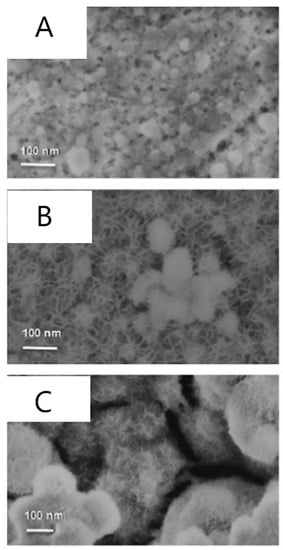 The textural properties of the LDH films prepared by potentiostatic electrodeposition were dependent on the duration of the potential pulse. Figure 5 shows the SEM characterization of Ni/Al LDH coatings coming from pulses of different length, i.e., 60 (A), 100 (B) and 200 s (C). At 60 s, a dense and homogeneous membrane made of nanoparticles with an average size lower than 50 nm, and connected in a gel-like manner was obtained. When the electrodeposition lasted longer, nanoparticles having a larger mean dimension were formed, still retaining the sand rose morphology typical of LDHs.