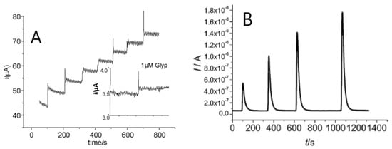Examples of I vs. t curve obtained (A): at a Ni/Al LDH coated Pt electrode in batch for seven successive additions of 0.125 mM Glyp, inset shows the LOD of Glyp (Eappl = +0.49 V vs. SCE) in 0.1 M NaOH; (B): at a Co/Al LDH coated Pt electrode in FIA, by injecting fructose solutions at different concentrations (1.0 × 10−4, 2.0 × 10−4, 3.0 × 10−4 and 4.0 × 10−4 M). Eluent: 0.01 M NaOH containing 0.1 M KNO3, flow rate: 1 mL min−1; Eapp: + 0.50 V vs. Ag/AgCl. Images reproduced from [59,60] with permission.