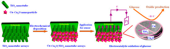 - Yang, Q.; Long, M.; Tan, L.; Zhang, Y.; Ouyang, J.; Liu, P.; Tang, A. Helical TiO2 Nanotube Arrays Modified by Cu−Cu2O with Ultrahigh Sensitivity for the Nonenzymatic Electro-oxidation of Glucose. ACS Appl. Mater. Interfaces 2015, 7, 12719–12730. [Google Scholar] [CrossRef] [PubMed]