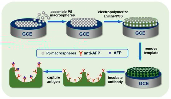 - Dabrowski, M.; Cieplak, M.; Sindhu, P.; Borowicz, P.; Noworyta, K.; Lisowski, W.; D’Souza, F.; Kuhn, A.; Kutner, W. Hierarchical templating in deposition of semi-covalently imprinted inverse opal polythiophene film for femtomolar determination of human serum albumin. Biosens. Bioelectron. 2017, 94, 155–161. [Google Scholar] [CrossRef]