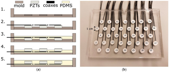 Figure 1b). Subsequently, the piezoelectric transducer elements are connected to coaxial cables and pressed into the holes such that they are fixated in the specified configuration, preventing them from moving or tilting during the next production steps. In the third step, liquid Polydimethylsiloxan (PDMS, Dow Corning Sylgard 184, mixed at ratio of 10:1 of base to catalyst) is poured into the mold to cover the PZTs. PDMS is a silicone which is flexible, robust, and has similar acoustic properties as human tissue; therefore, it is used in many biomedical US applications [