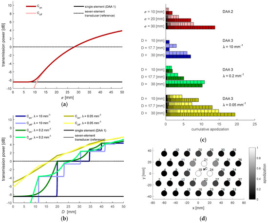 Figure 10). Compared to a seven-element US transducer which uses all elements for transmission, these parameters lead to a reduction of total transmission power by −3.7 dB and −3.2 dB. This supports the clinically desired as-low-as-reasonably-achievable principle, which states that acoustic dose should be kept as low as possible, even if exposure limits are below US safety guidelines [