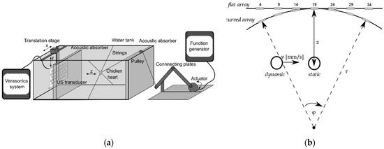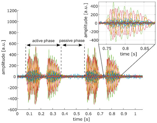 Figure 12 highlights an example of a measurement where the chicken heart is centrally located in front of a curved transducer array. For visualization purposes, only the received Doppler signals of element