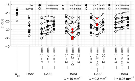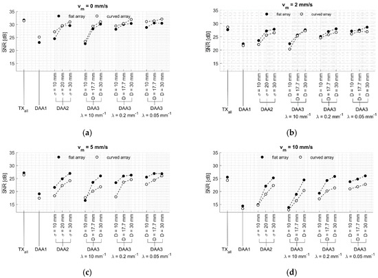 This general trend of improved for increasing window width holds also for the dynamic experiments, where the transducer array is translated through the water tank at different velocities. As expected, the overall signal quality is reduced, indicated by the reduced , with increasing velocities. Interestingly, it can be seen that for velocities vm = 5 mm/s to vm = 10 mm/s, the TXall methods and DAA methods with large window width show an reduction by approximately 5 dB, while the DAA1 and DAA methods with small window width show an reduction by approximately 10 dB. This is because at higher velocities the heart moves too fast out of the US beam created by a single element. In that case, the signal quality is reduced before the DAA method has updated the apodization according to the new heart location.