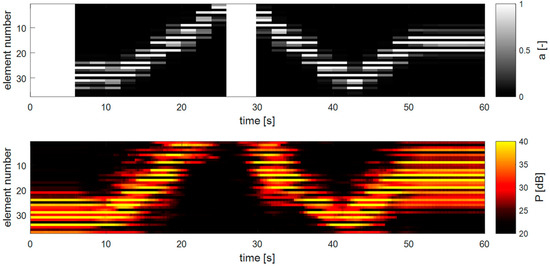 Figure 11 shows an example of how the apodization adapts to a changing fetal heart location. In the top panel, the apodization values of each transducer element are shown over time, and in the lower panel, the respective Doppler power measured for each element is depicted. In the beginning, the heart is located on one side of the array and after 6 s, the DAA method is turned on. Then, after 10 s, the heart is translated through the measurement volume of the transducer array. It is clearly visible that the DAA-method is able to adapt to the new fetal heart location. It is also visible that the apodization function is updated according to the preceding power values and that within the 2 s before the next apodization update is executed, the fHL has changed already considerably. This is noticeable by the fact that the apodization appears to lag behind the measured Doppler power, suggesting that a faster apodization update frequency may be needed. At approximately 25 s, the heart leaves the field of view of the transducer array, and the method reinitializes using the initial apodization function. When the heart re-enters the measurement range, the DAA automatically adapts its apodization to track the fetal heart.