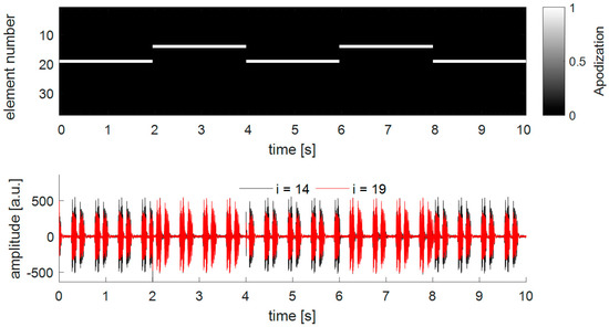i = 14 are displayed. It can be seen that at each apodization update, i.e., every 2 s, the apodization switches from element