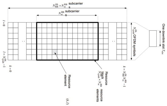 - Bandwidth and sub-carrier spacing: The size of resource blocks (RBs) is determined by the product of the number of sub-carriers on the frequency-axis and the number of symbols on the time-axis, as shown in Figure 1 [21]. Bandwidth is set to 5 MHz in this paper. The maximum number of available RBs is 25 at bandwidth of 5 MHz. When sub-carrier spacing is applied to 15 kHz, 12 sub-carriers are allocated in one RB on the frequency-axis and 14 symbols are allocated per sub-frame on the time-axis. A sub-frame consists of two slots and one slot consists of seven symbols. Assuming that the full band of 5 MHz is assigned to UE, 4200 resource elements (REs) can be allocated to UE for one sub-frame since 4200 REs are calculated by 25 RBs × 12 sub-carriers × 7 symbols × 2 slots per sub-frame. In other words, one RE is equivalent to the minimum resource for a symbol time on the time-axis and a sub-carrier on the frequency-axis.
