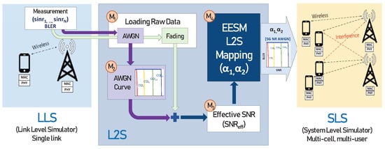 L2S mapping method has two aims to map various SNRs over allocated REs to one averaged SNR as well as to reduce system overload in SLS. The overall procedure of the L2S mapping is shown in Figure 2 where L2S mapping method basically receives raw data of and from the LLS and then delivers two mapping parameters of (, ) and 5G NR AWGN to the SLS. Our L2S mapping is composed of four modules: , loading raw data; , AWGN curve; , Effective SNR (ESM); and , exponential ESM (EESM) L2S mapping. The operation and function of each module are explained below.