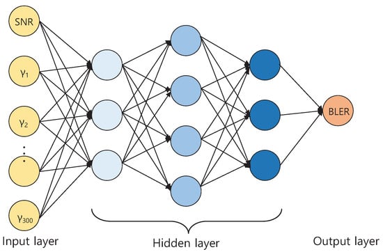 The number of simulations was 10,000 for each input SNR and each CQI and 1000 TBs were generated for each simulation. BLER was determined for transmitted 1000 TBs. Thus, the size of raw data of (, , ) to collect from LLS, i.e., the total number of simulation results per CQI was the product of the number of SNR values and the the number of simulations. In general, since the size of raw data from the LLS is large, obtaining the optimal parameters of and through heuristic search with Equation (10) is burdensome. Thus, it was necessary to reduce the computation complexity as well as to improve the accuracy. As shown in this section, we used Python Tensorflow framework and applied the DNN regression method to make an AWGN fitting curve of module in Section 3.3. The algorithm of DNN regression is described in Algorithm 2 and Figure 3.