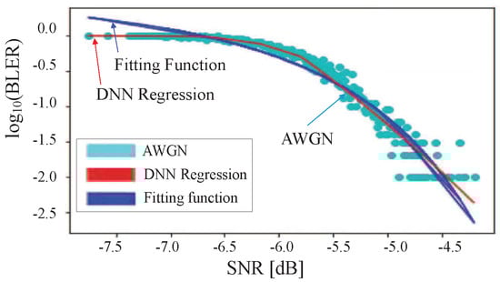 Table 2 shows the system parameters used. To make AWGN curve, we used a DNN regression method. Actually, we already showed that a DNN regression is a more suitable method than a fitting function under 4G LTE-A systems in our previous work [12]. The fitting curve became over-fitted as BLER approached zero, as shown in Figure 4. In contrast, a DNN regression followed AWGN curve as closely as possible through a multi-dimensional mapping. Moreover, Table 4 shows MSE results for fitting function (“FIT”) and DNN regression (“DNN”) for all CQIs under 4G LTE-A systems. Actually, the deep neural network gave little improvement compared to fitting algorithm under AWGN channel condition since AWGN was an almost static channel environment. Accordingly, in this study, 5G NR AWGN curve was generated with a DNN regression method without comparison of FIT and DNN.