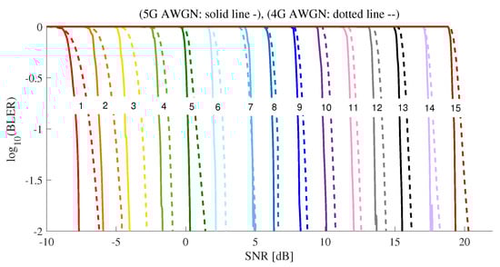 Figure 5 shows BLER performance for 4G AWGN and 5G AWGN. 4G LTE-A systems and 5G NR systems use Turbo-code and LDPC as channel coding schemes, respectively. The size of TB and their coding rates varied slightly according to channel coding schemes, as shown in Table 3. After applying the channel coding shown in Table 3, the performances of 4G AWGN and 5G NR AWGN were evaluated. 5G NR AWGN outperformed 4G AWGN, especially better for small CQL values.